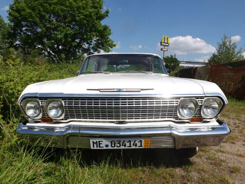 Hiermit wird ein „Impala“ angeboten, wie er schöner und besser nicht sein könnte. Und ich meine nicht eine „Schwarzversen Antilope“ aus der afrikanischen Gattung der „Hornträger“ namens „Impala“. Nein, hier geht es diesmal um einen „Chevy Impala“, eines der aufregendsten Coupes der sogenannten amerikanischen „Straßenkreuzergeneration“. Aber er sieht nicht nur atemberaubend schön aus, er fährt auch atemberaubend- und das mit einer Leichtigkeit, die ihresgleichen sucht. Der kraftvolle V8 Motor blubbert angenehm und lässt erahnen, wie bärenstark er ist. Und die perfekte Servolenkung und Servobremse vermittelt eine unglaubliche Leichtigkeit des Fahrens. Außerdem hat dieses geräumige große Sportcoupe einen sehr geringen Lenkradius wie ein europäischer Kleinwagen. In der Stadt also perfekt zum Einparken und auf der Autobahn oder Landstraße ein Gedicht! Man fühlt sich wie am Steuer eines Passagierschiffes. Eigentlich wirkt dieses amerikanische Sportcoupe wie neu oder mindestens wie ein Vorführwagen von 1963, als er von der Chevrolet Vertretung in Georgia ausgeliefert worden ist. Perfekter geht es nun mal nicht. Wer also ein geräumiges amerikanisches Coupe sucht, mit dem man sportlich und bequem „durch die Lande reisen kann“, hat hiermit das ideale Exemplar gefunden. Das alles wird nur noch getoppt durch die fantastische Innenausstattung, die ebenfalls wie ladenneu wirkt und sogar riecht. Mehr geht nicht und dieses fantastische Fahrzeug ist hier und heute verfügbar.